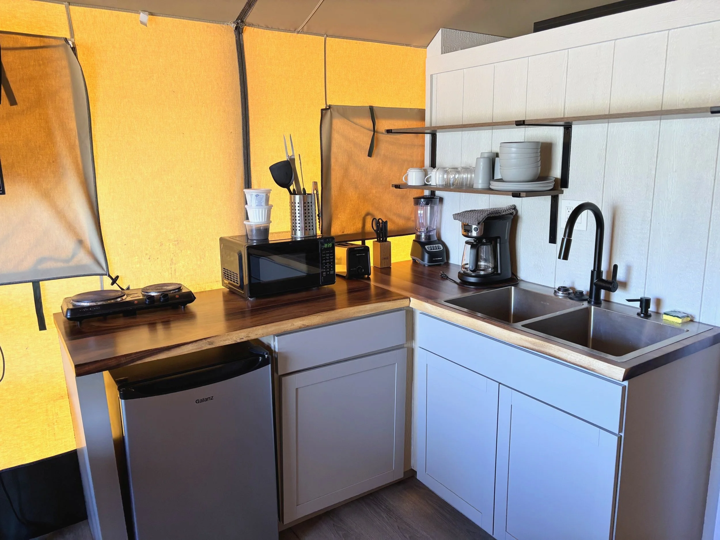 "Our glamping cabin was perfect — the kitchenette had everything we needed to cook, and the AC kept us comfortable all night. So worth it to not have to set up a tent!"